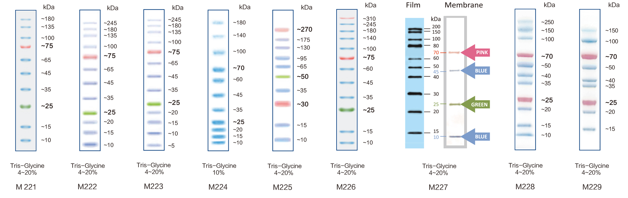 本產(chǎn)品由跨度從 5-245 kDa 的 13 種高度純化預(yù)染的重組蛋白質(zhì)組成,各條帶濃度約為 0.1-0.4 mg/ml。其中 25 kDa 條帶為綠色預(yù)染條帶,75 kDa 條帶為紅色預(yù)染條帶,方便判斷各個(gè)條帶的準(zhǔn)確位置。本產(chǎn)品適合作為 SDS-PAGE 電泳時(shí),變性蛋白樣品的分子量參照,并可實(shí)時(shí)觀察蛋白樣品的電泳分離狀況,也可用于檢測(cè) Western blot 的轉(zhuǎn)膜效率。由于共價(jià)結(jié)合的染料會(huì)影響蛋白質(zhì)分子的電泳遷移率,本產(chǎn)品僅適于粗略地估計(jì)目的蛋白樣品的分子量。