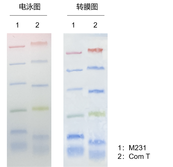 分別使用GenStar #M230 和 Com T進(jìn)行電泳,Tricine 膠濃度18%,上樣量5 μl、電壓150 V,電泳100 min,電泳結(jié)束后進(jìn)行轉(zhuǎn)膜實(shí)驗(yàn),轉(zhuǎn)膜電壓200 V、時(shí)間60 min。結(jié)果顯示,M230電泳和轉(zhuǎn)膜條帶均清晰可見(jiàn),小條帶效果優(yōu)于Com T。