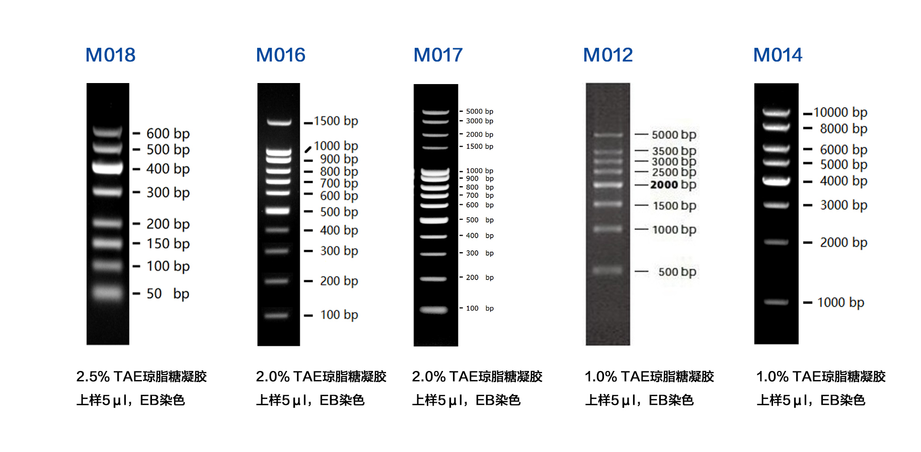 本產(chǎn)品為預(yù)混有 1x 上樣緩沖液的即用型 DNA 分子量標(biāo)準(zhǔn),由 14 條線狀雙鏈 DNA 條帶組成,適用于對(duì) 100-5000 bp 的雙鏈 DNA 分子大小的估算和粗略定量。本產(chǎn)品的 14 條帶分別為 100、200、300、400、500、600、700、800、900、1000、1500、2000、3000 和 5000 bp。上樣 5 ul 時(shí)各條帶的 DNA 含量分別為 50 ng、40 ng、30 ng、40 ng、100 ng、60 ng、70 ng、80 ng、90 ng、100 ng、50 ng、50 ng、50 ng、50 ng。