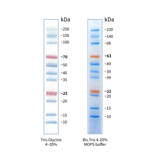 本產(chǎn)品由跨度從 10-250 kDa 的 11 種高度純化的橙色、藍(lán)色預(yù)染蛋白質(zhì)組成。其中 25 kDa 條帶和 70 kDa 條帶為橙紅色預(yù)染條帶。本產(chǎn)品適合作為 SDS-PAGE 電泳時(shí),變性蛋白樣品的分子量參照,并可實(shí)時(shí)觀察蛋白樣品的電泳分離狀況,也可用于檢測 Western blot 的轉(zhuǎn)膜效率。由于共價(jià)結(jié)合的染料會(huì)影響蛋白質(zhì)分子的電泳遷移率,本產(chǎn)品僅適于粗略地估計(jì)目的蛋白樣品的分子量。