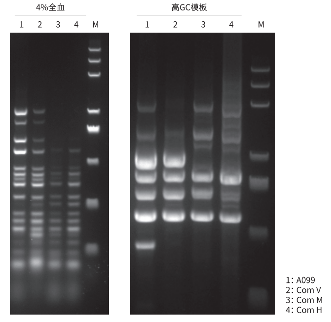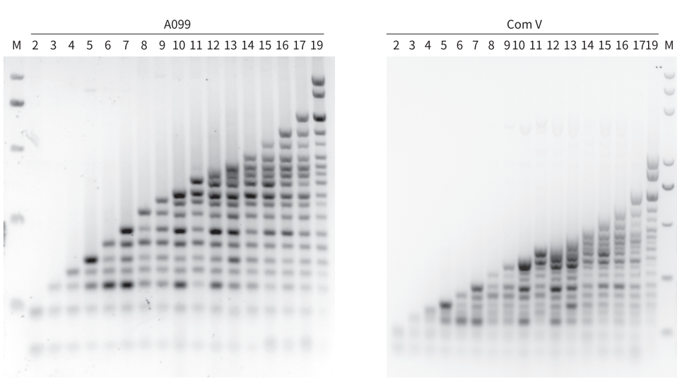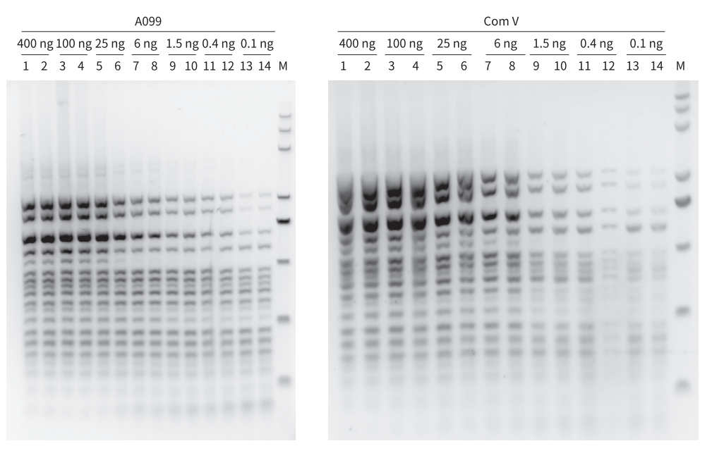 以 Human 基因組為模板,同時擴增 19 個目的片段。結(jié)果顯示,A099 最低檢測限可達 0.1 ng,不會出現(xiàn)條帶丟失且條帶清晰優(yōu)于 Com V