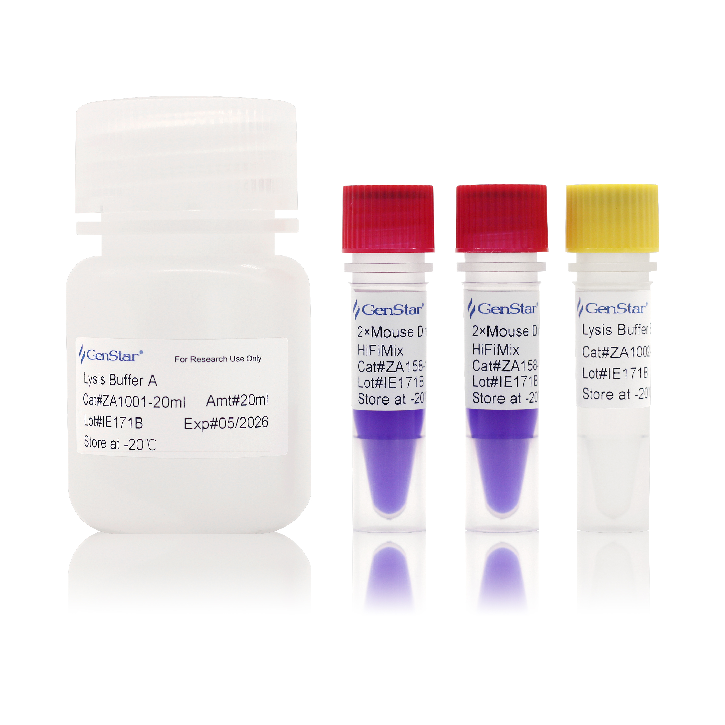 本產(chǎn)品包含小鼠組織粗提和后續(xù) PCR 擴(kuò)增的整套試劑,適用于小鼠基因型快速鑒定。采用獨(dú)特的裂解液可從小鼠尾巴、耳朵以及腳趾等組織中快速釋放基因組 DNA,無需純化,可直接用于后續(xù)的 PCR 擴(kuò)增和鑒定,極大縮短了實(shí)驗(yàn)耗時(shí)。