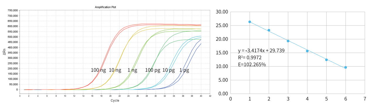 以 100 ng、10 ng、1ng、100pg、10pg、1pg 的小鼠 RNA 為模板,使用 A388 進(jìn)行檢測。結(jié)果顯示,A388 的檢測下限可達(dá) 1 pg,且擴增效率高