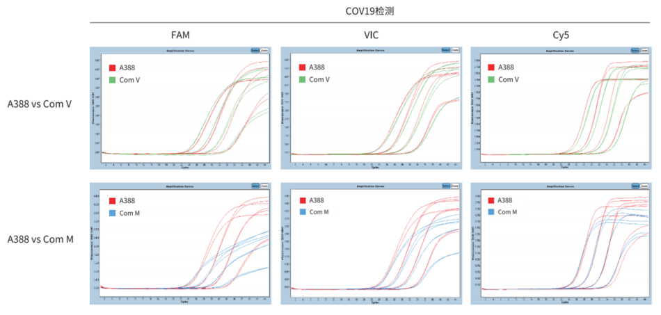 以不同濃度的 COV19 為模板,分別用 A388、 Com V 、Com M 進(jìn)行檢測。結(jié)果顯示,A388 和 Com V、Com M 擴增效果相當(dāng),A388 擴增曲線和熒光強度優(yōu)于 Com M