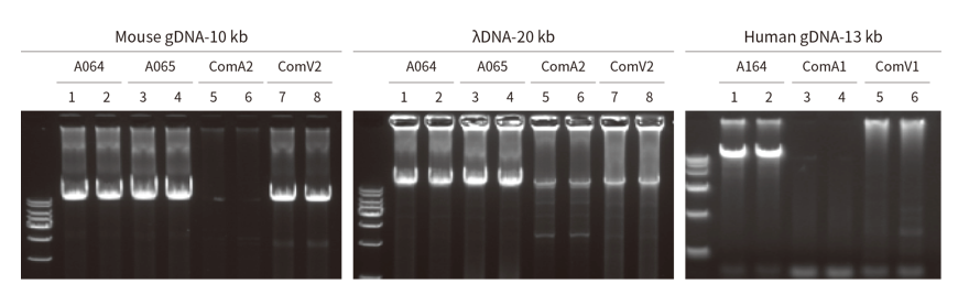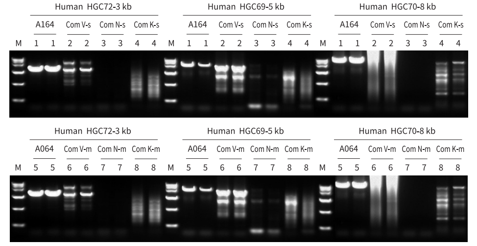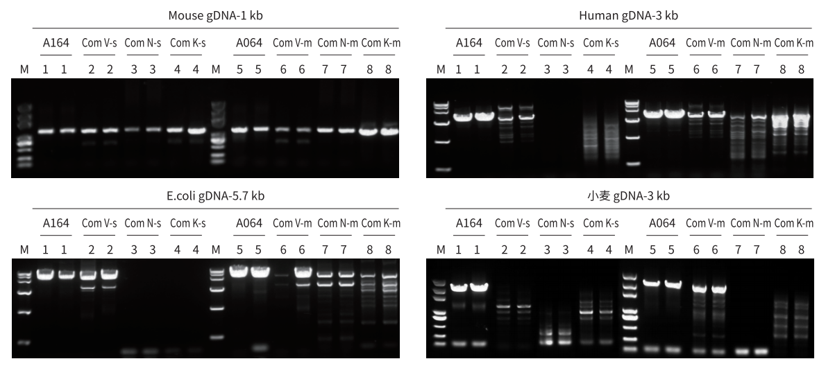 分別以人、小鼠、小麥、E.coli gDNA 為模板,使用 A064/A164、Com V、Com N、Com K 進(jìn)行不同長(zhǎng)度片段擴(kuò)增。結(jié)果顯示,A064/A164 對(duì)不同種屬來源不同長(zhǎng)度的 gDNA 片段兼容性強(qiáng),均能良好擴(kuò)增,且優(yōu)于 Com V、Com N 和 Com K