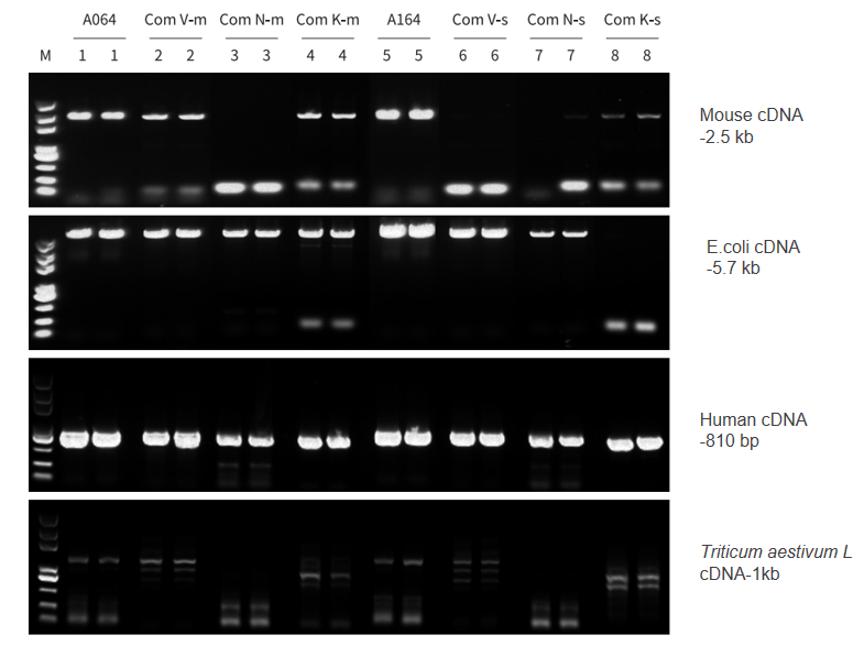 分別以人、小鼠、E.coli cDNA 為模板,使用 A064/A164、Com V、Com N、Com K 進(jìn)行不同長(zhǎng)度片段擴(kuò)增。結(jié)果顯示,A064/A164 對(duì)不同種屬來源不同長(zhǎng)度的 cDNA 片段兼容性強(qiáng),均能良好擴(kuò)增