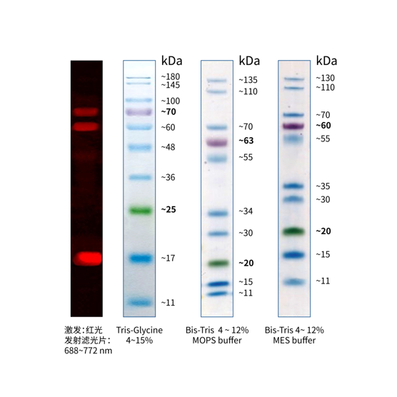 本產(chǎn)品由跨度從 11-180 kDa 的 10 種高度純化預染的重組蛋白質(zhì)組成。10 種條帶分別為:11、17、25、36、48、60、70、100、145、180 kDa。其中 25 kDa 條帶為綠色預染條帶,70 kDa 條帶為紫色預染條帶,17、60、70 kDa 三個條帶可用于紅色波長(635 nm 激光或紅色 LED )的熒光印跡檢測,方便判斷各個條帶準確位置。