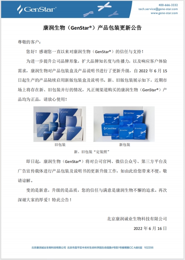 【包裝更換】康潤(rùn)生物(GenStar)產(chǎn)品包裝更新公告