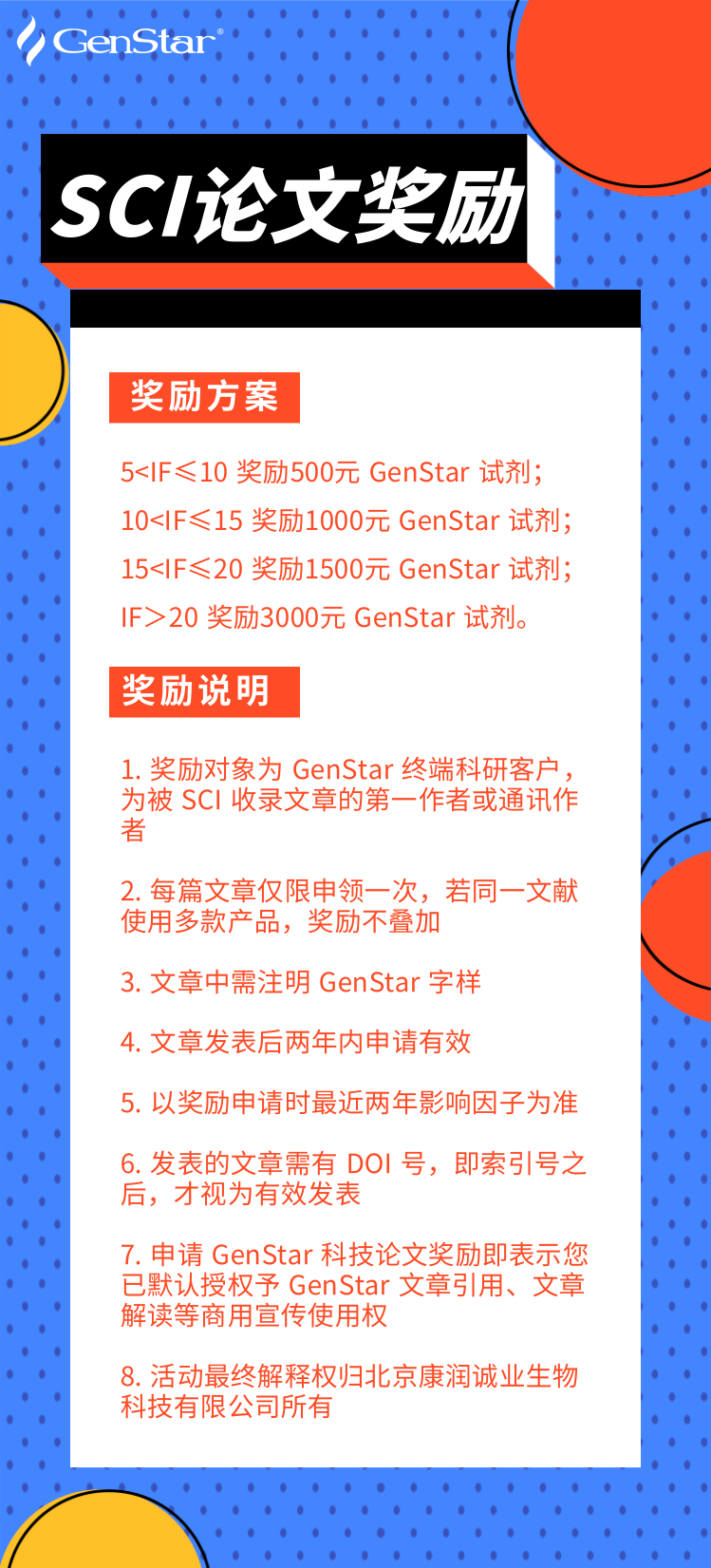 GenStar 自成立以來,一直深耕于分子生物學(xué)領(lǐng)域上游核心原料及配套體系的研發(fā),服務(wù)了全國數(shù)千家實(shí)驗(yàn)室的科研人員。使用 GenStar 產(chǎn)品的 SCI 論文總數(shù)已達(dá)千余篇,其中包含《Nature》、《Science》、《Cell》等高水平的學(xué)術(shù)期刊。為了感謝廣大客戶的支持與信任,GenStar 繼續(xù)推行發(fā)表科技論文獎(jiǎng)勵(lì)機(jī),使用 GenStar 產(chǎn)品發(fā)表科技論文的人員均可申請。希望更多新老客戶參與其中,期待和您一起分享成功的喜悅。
