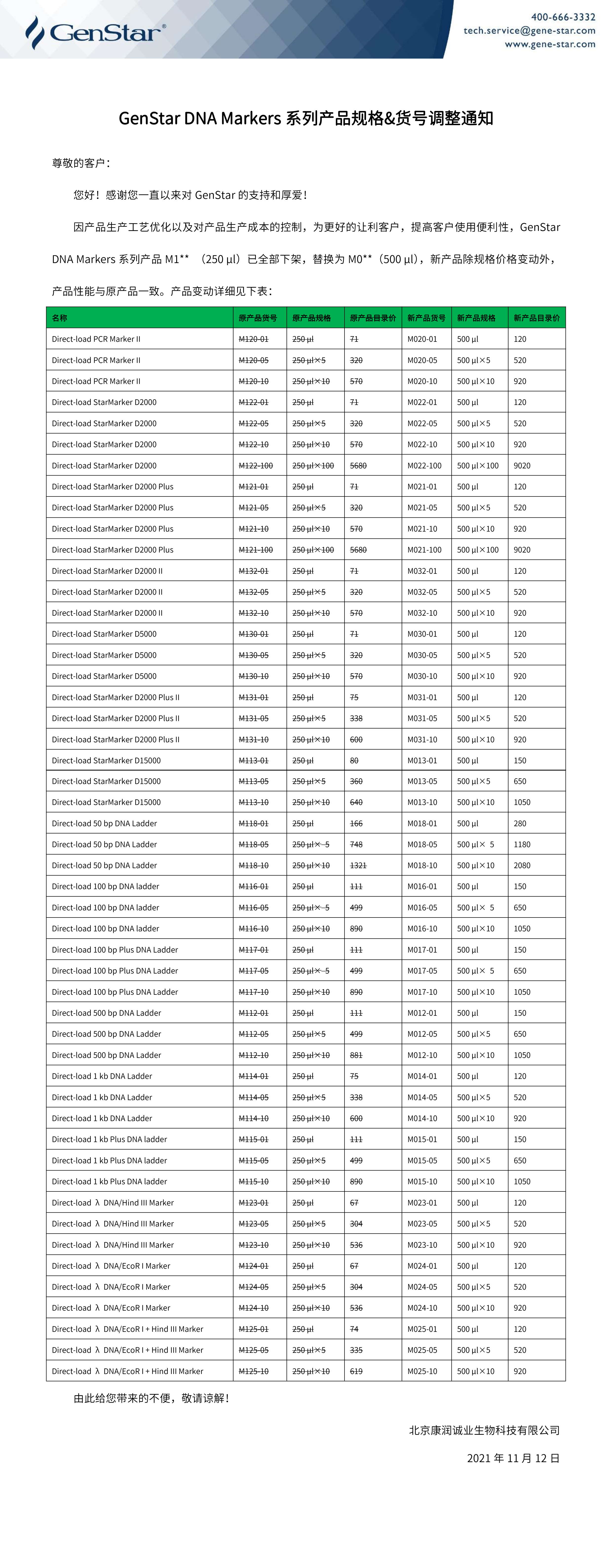 GenStar DNA Markers 系列產(chǎn)品規(guī)格&貨號(hào)調(diào)整通知